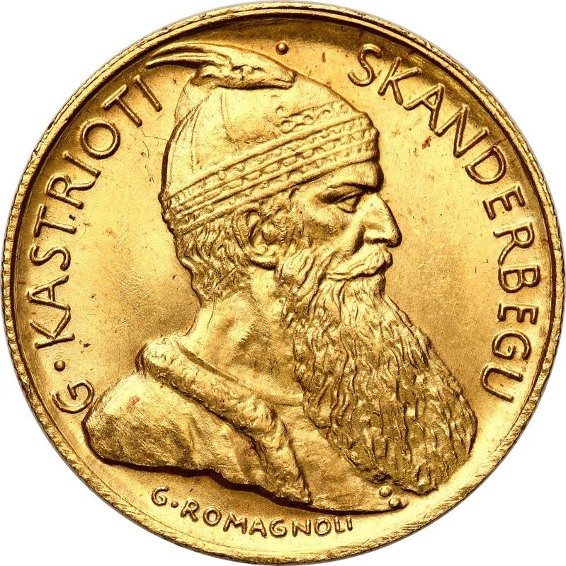 Find out the current coin value of the Albanian 20 Franga Ari 1927 "Skanderbeg" with mark V. This gold coin from the times of Ahmet Zogu struck at the Vienna Mint. Wondering how much a coin like this is worth? The record price belongs to the lot 30038 sold at the Heritage Auctions auction for USD 15,600. Bidding took place August 27, 2025.