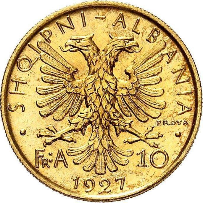 Find out the current coin value of the Albanian Pattern 10 Franga Ari 1927 with mark R. PROVA. This gold coin from the times of Ahmet Zogu struck at the Rome Mint. Wondering how much a coin like this is worth? The record price belongs to the lot 124 sold at the Numismatica Genevensis SA auction for CHF 5,000. Bidding took place November 14, 2022.