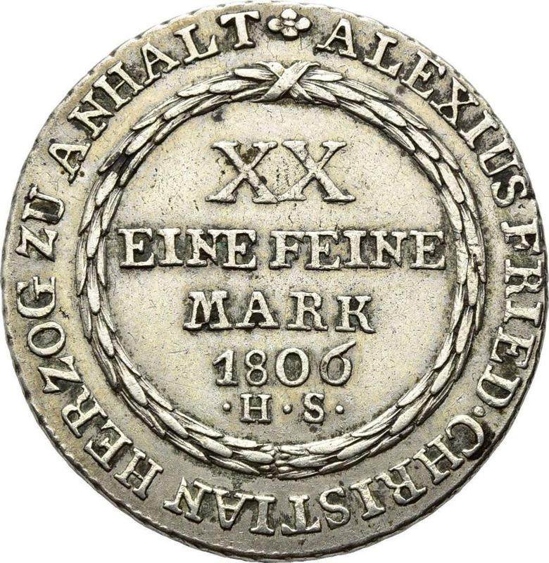 Find out the current coin value of the Anhalt-Bernburg Gulden 1806 with mark HS. This silver coin from the times of Alexius Frederick Christian struck at the Harzgerode Mint. Wondering how much a coin like this is worth? The record price belongs to the lot 1729 sold at the Leipziger Münzhandlung Heidrun Höhn auction for EUR 240. Bidding took place April 19, 2013.