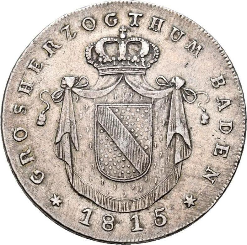Find out the current coin value of the Baden Thaler 1815 with mark D. This silver coin from the times of Charles Louis Frederick struck at the Mannheim Mint. Wondering how much a coin like this is worth? The record price belongs to the lot 31818 sold at the Heritage Auctions auction for USD 2,880. Bidding took place May 5, 2022.