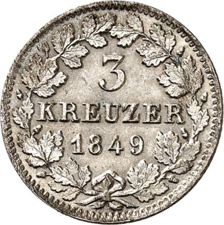Find out the current coin value of the Baden 3 Kreuzer 1849 . This silver coin from the times of Leopold struck at the Karlsruhe Mint. Wondering how much a coin like this is worth? The record price belongs to the lot 4042 sold at the Münzzentrum Rheinland, Heinz-W. Müller auction for EUR 35. Bidding took place October 17, 2018.