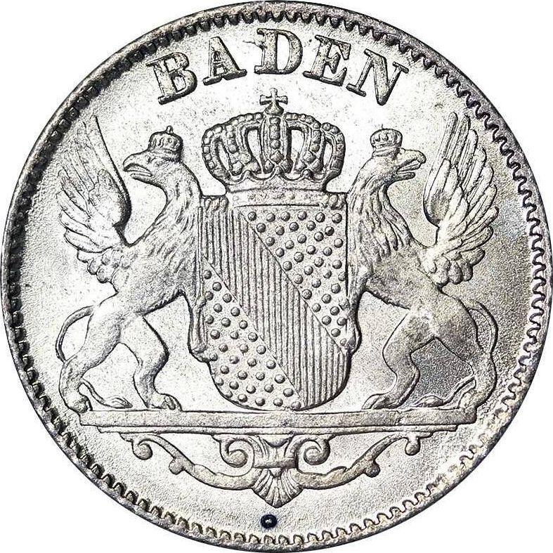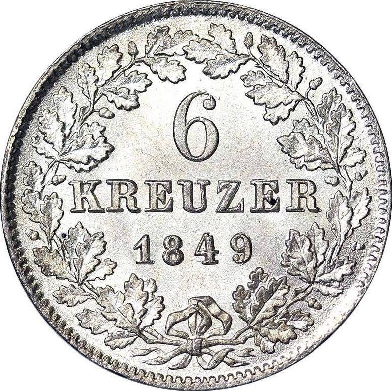 Find out the current coin value of the Baden 6 Kreuzer 1849 . This silver coin from the times of Leopold struck at the Karlsruhe Mint. Wondering how much a coin like this is worth? The record price belongs to the lot 3846 sold at the Teutoburger Münzauktion GmbH auction for EUR 60. Bidding took place December 9, 2011.