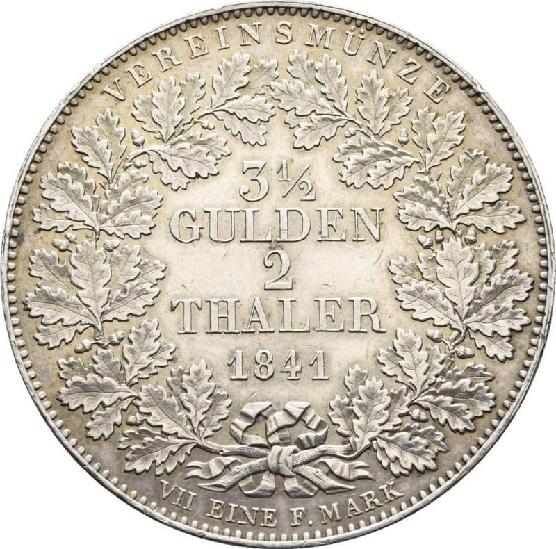 Find out the current coin value of the Bavarian 2 Thaler 1841 . This silver coin from the times of Ludwig I struck at the Munich Mint. Wondering how much a coin like this is worth? The record price belongs to the lot 2697 sold at the Heidelberger Münzhandlung Herbert Grün auction for EUR 1,700. Bidding took place May 16, 2017.