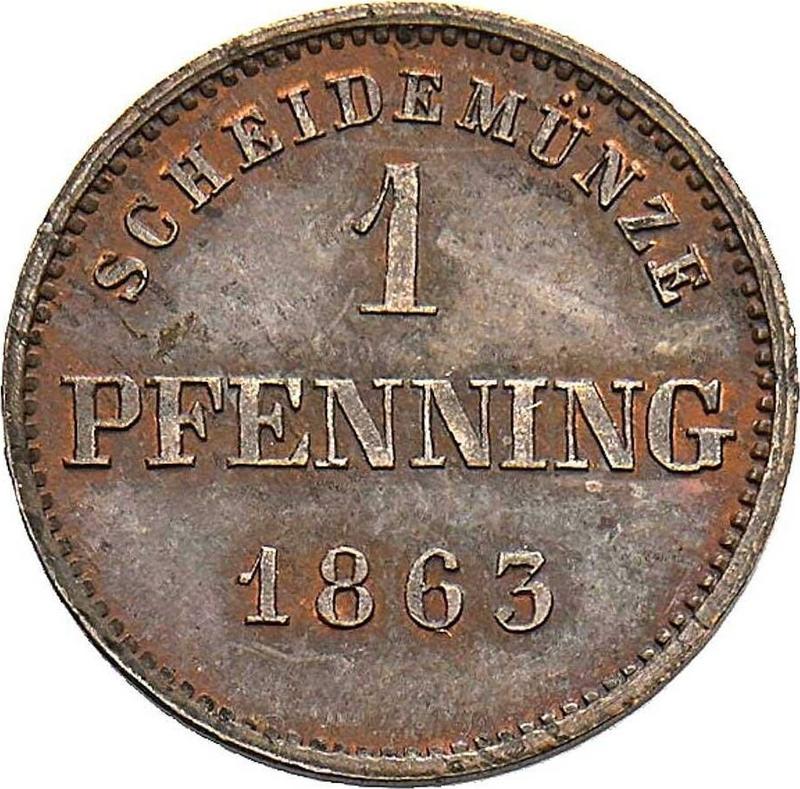 Find out the current coin value of the Bavarian 1 Pfennig 1863 . This copper coin from the times of Maximilian II struck at the Munich Mint. Wondering how much a coin like this is worth? The record price belongs to the lot 732 sold at the WAG online Auktionen oHG auction for EUR 60. Bidding took place June 13, 2021.