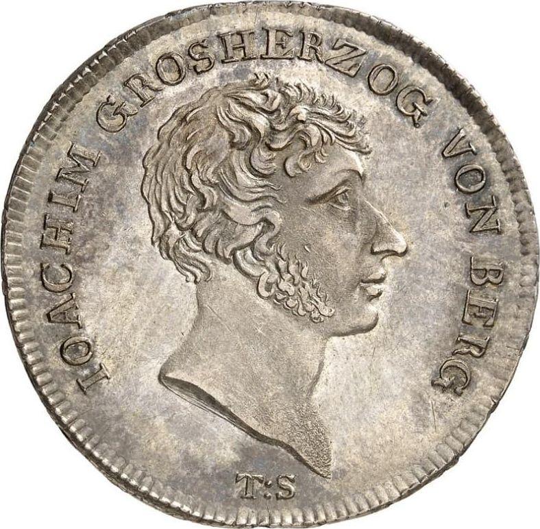 Find out the current coin value of the Berg Thaler 1807 with mark T.S.. This silver coin from the times of Joachim Murat struck at the Düsseldorf Mint. Wondering how much a coin like this is worth? The record price belongs to the lot 1225 sold at the Fritz Rudolf Künker GmbH & Co. KG auction for EUR 16,000. Bidding took place June 29, 2021.