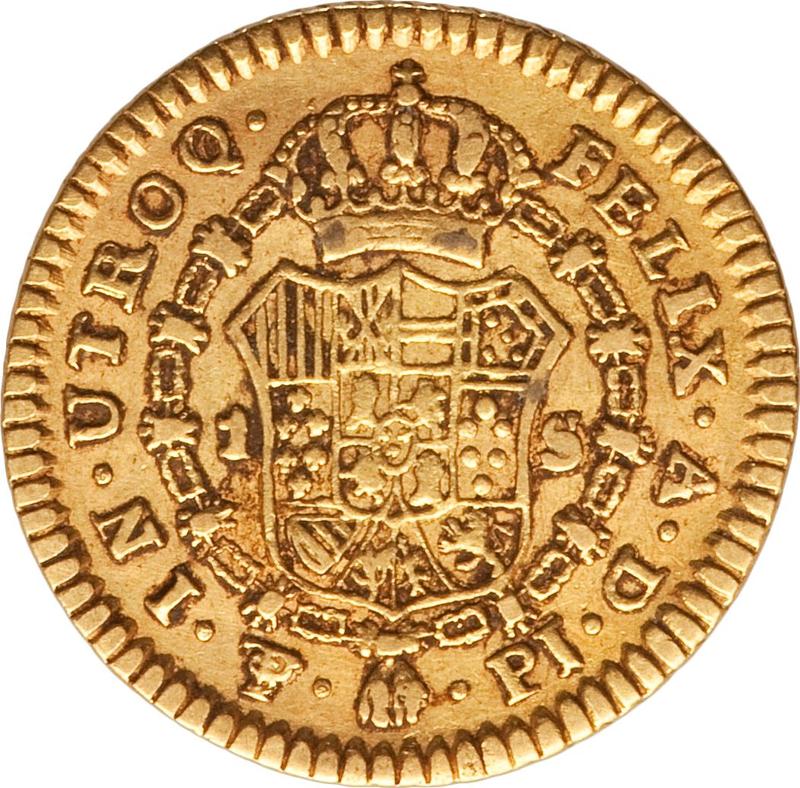 Find out the current coin value of the Bolivia 1 Escudo 1806 with mark PTS PJ. This gold coin from the times of Charles IV struck at the Potosi Mint. Wondering how much a coin like this is worth? The record price belongs to the lot 5477 sold at the Cayón Subastas auction for EUR 2,225. Bidding took place September 28, 2022.