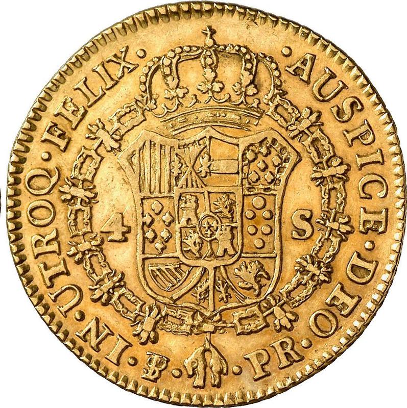 Find out the current coin value of the Bolivia 4 Escudos 1791 with mark PTS PR. This gold coin from the times of Charles IV struck at the Potosi Mint. Wondering how much a coin like this is worth? The record price belongs to the lot 1447 sold at the Jesús Vico auction for EUR 25,000. Bidding took place June 25, 2025.