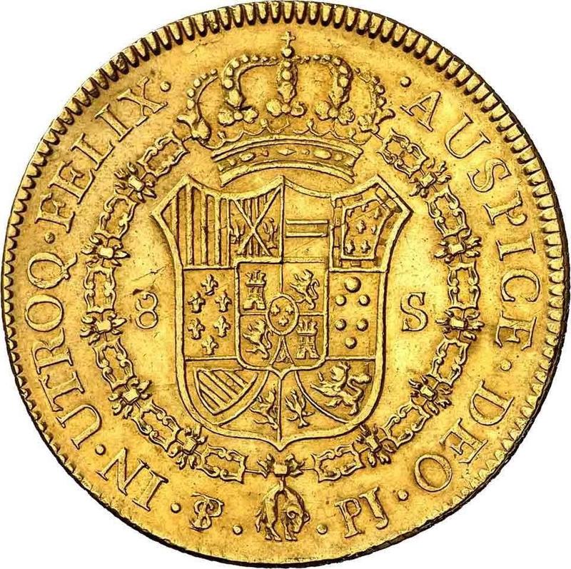 Find out the current coin value of the Bolivia 8 Escudos 1805 with mark PTS PJ. This gold coin from the times of Charles IV struck at the Potosi Mint. Wondering how much a coin like this is worth? The record price belongs to the lot 479 sold at the Chaponnière & Firmenich SA auction for CHF 7,000. Bidding took place November 20, 2019.