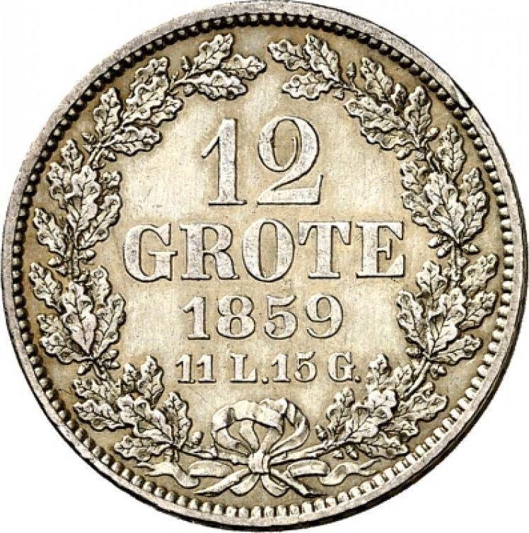 Find out the current coin value of the Bremen 12 Grote 1859 . This silver coin from the times of Free City struck at the Braunschweig Mint. Wondering how much a coin like this is worth? The record price belongs to the lot 1332 sold at the Fritz Rudolf Künker GmbH & Co. KG auction for EUR 550. Bidding took place February 9, 2016.