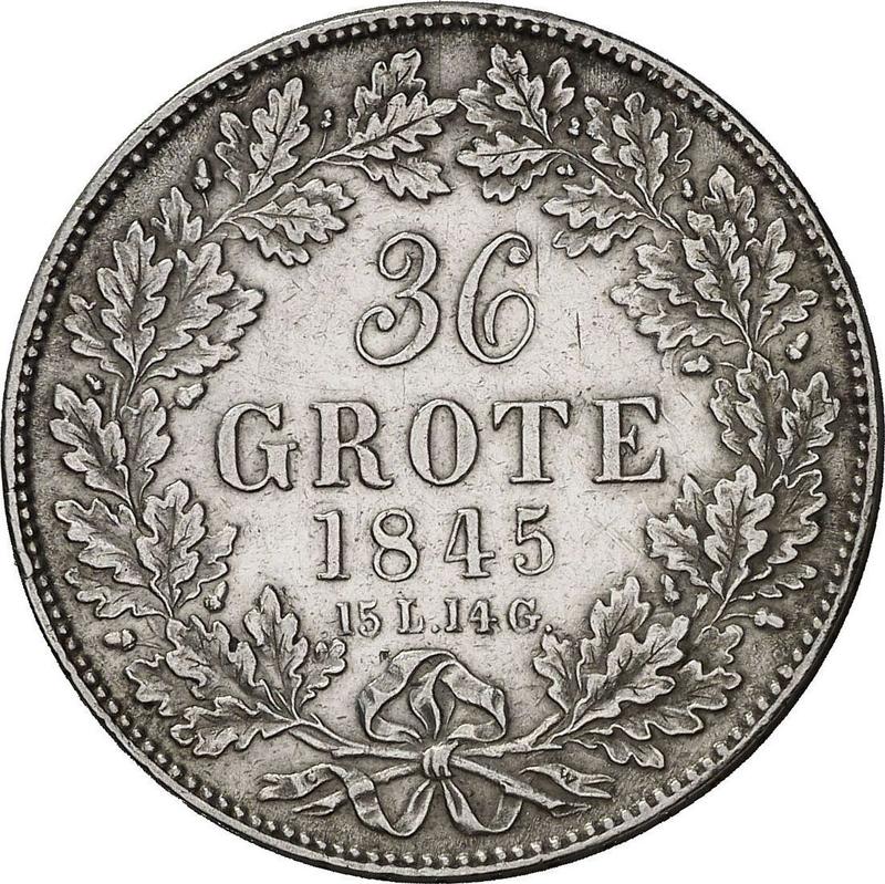 Find out the current coin value of the Bremen 36 Grote 1845 . This silver coin from the times of Free City struck at the Bremen Mint. Wondering how much a coin like this is worth? The record price belongs to the lot 906 sold at the Lockdales Auctioneers auction for GBP 650. Bidding took place January 21, 2025.