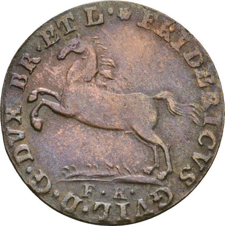 Find out the current coin value of the Brunswick-Wolfenbüttel 1 Pfennig 1814 with mark FR. This copper coin from the times of Frederick William struck at the Braunschweig Mint. Wondering how much a coin like this is worth? The record price belongs to the lot 825 sold at the Russiancoin auction for RUB 650. Bidding took place May 26, 2022.