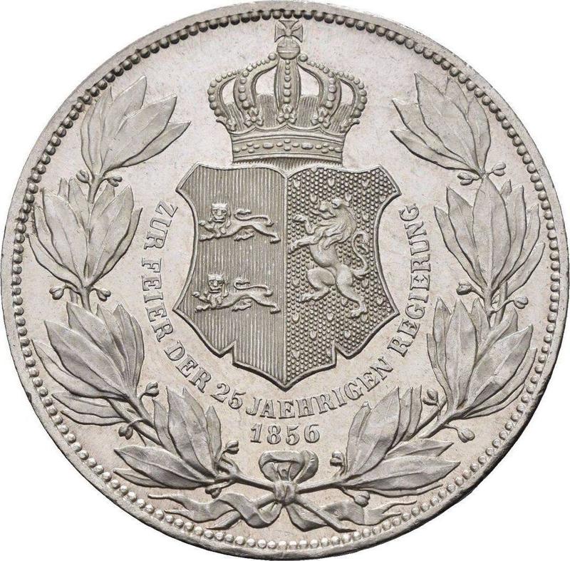 According to the latest data as of December 5, 2025 the average price of a Silver coin 2 Thaler 1856 "25 years of government" with mark B is 430 USD for regular strike and 1100 USD for coins minted using the PROOF technology.