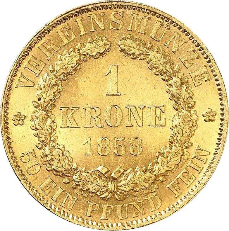 Find out the current coin value of the Brunswick-Wolfenbüttel Krone 1858 with mark B. This gold coin from the times of William struck at the Braunschweig Mint. Wondering how much a coin like this is worth? The record price belongs to the lot 1107 sold at the Fritz Rudolf Künker GmbH & Co. KG auction for EUR 5,500. Bidding took place June 21, 2022.