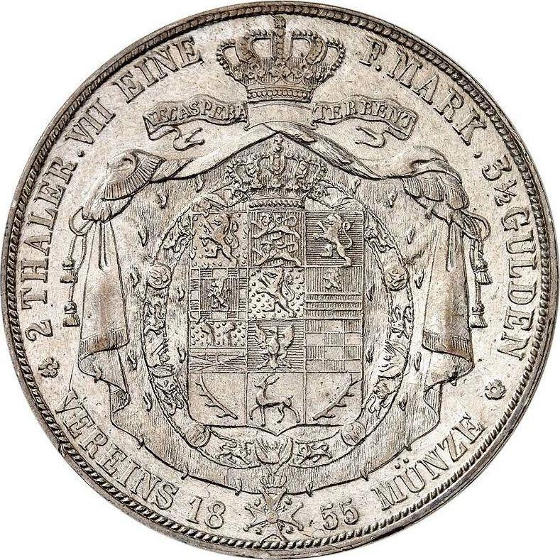 Find out the current coin value of the Brunswick-Wolfenbüttel 2 Thaler 1855 with mark B. This silver coin from the times of William struck at the Braunschweig Mint. Wondering how much a coin like this is worth? The record price belongs to the lot 34595 sold at the Heritage Auctions auction for USD 2,880. Bidding took place November 5, 2020.