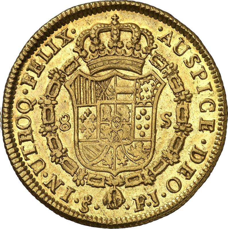 Find out the current coin value of the Chilean 8 Escudos 1806 with mark So FJ. This gold coin from the times of Charles IV struck at the Santiago Mint. Wondering how much a coin like this is worth? The record price belongs to the lot 34396 sold at the Heritage Auctions auction for USD 7,800. Bidding took place January 21, 2025.
