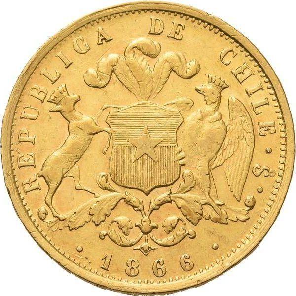 Find out the current coin value of the Chilean 10 Pesos 1866 with mark So. This undefined coin from the times of Republic struck at the Santiago Mint. Wondering how much a coin like this is worth? The record price belongs to the lot 71480 sold at the Stack's Bowers auction for USD 1,600. Bidding took place February 27, 2023.