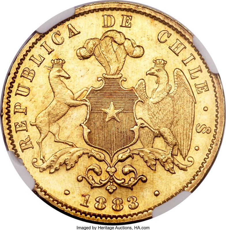 Find out the current coin value of the Chilean 10 Pesos 1883 with mark So. This undefined coin from the times of Republic struck at the Santiago Mint. Wondering how much a coin like this is worth? The record price belongs to the lot 22040 sold at the Heritage Auctions auction for USD 1,560. Bidding took place January 16, 2023.
