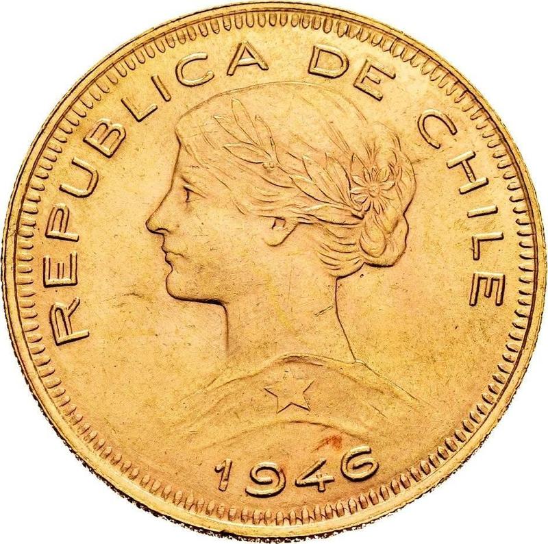 Find out the current coin value of the Chilean 100 Pesos 1946 with mark So. This gold coin from the times of Republic struck at the Santiago Mint. Wondering how much a coin like this is worth? The record price belongs to the lot 3002 sold at the Bolaffi S.p.A. auction for EUR 3,000. Bidding took place June 6, 2024.