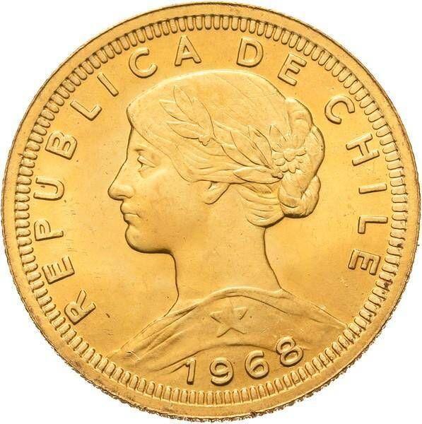 Find out the current coin value of the Chilean 100 Pesos 1968 with mark So. This gold coin from the times of Republic struck at the Santiago Mint. Wondering how much a coin like this is worth? The record price belongs to the lot 91 sold at the WAG online Auktionen oHG auction for EUR 1,350. Bidding took place May 12, 2024.