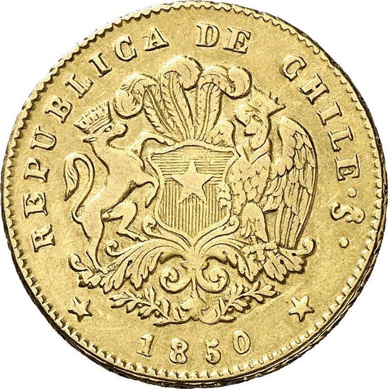 Find out the current coin value of the Chilean 2 Escudos 1850 with mark So LA. This gold coin from the times of Republic struck at the Santiago Mint. Wondering how much a coin like this is worth? The record price belongs to the lot 3173 sold at the Aureo & Calicó, S.L. auction for EUR 285. Bidding took place May 28, 2013.