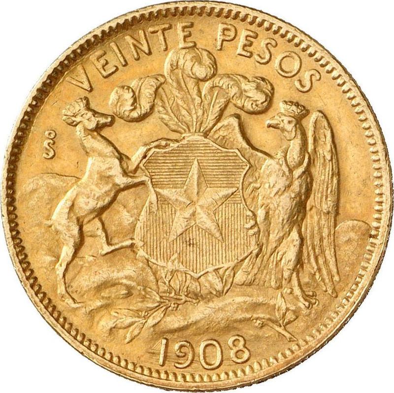 20 Pesos 1908 So (Chile, Republic)