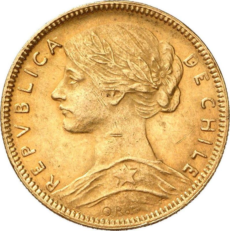 Find out the current coin value of the Chilean 20 Pesos 1908 with mark So. This gold coin from the times of Republic struck at the Santiago Mint. Wondering how much a coin like this is worth? The record price belongs to the lot 1410 sold at the Classical Numismatic Group, LLC auction for USD 1,600. Bidding took place August 1, 2014.