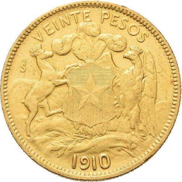 Find out the current coin value of the Chilean 20 Pesos 1910 with mark So. This gold coin from the times of Republic struck at the Santiago Mint. Wondering how much a coin like this is worth? The record price belongs to the lot 35242 sold at the Heritage Auctions auction for USD 7,200. Bidding took place August 27, 2025.