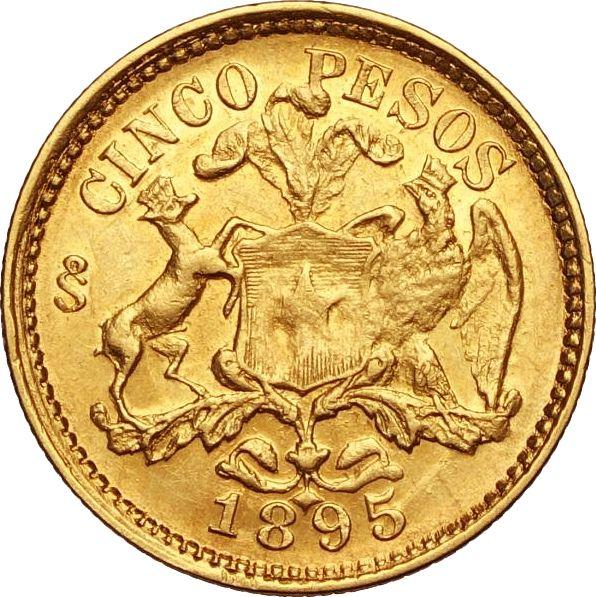The information on the current value of the Chilean coin 5 Pesos 1895 with the letters So is based on actual auction sales of similar specimens. To reflect the current price level, our service monitors over 590 numismatic companies and records auction results in the coin catalog and auction archive. Please note that the exact value depends directly on the coin's condition, so the average price serves only as an approximate estimate.