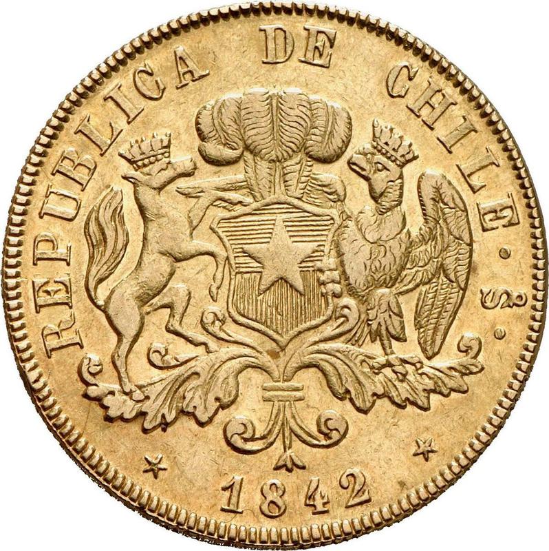 Find out the current coin value of the Chilean 8 Escudos 1842 with mark So IJ. This gold coin from the times of Republic struck at the Santiago Mint. Wondering how much a coin like this is worth? The record price belongs to the lot 23330 sold at the Heritage Auctions auction for USD 12,925. Bidding took place January 5, 2014.
