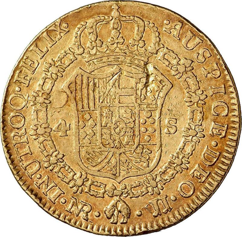 Find out the current coin value of the Colombia 4 Escudos 1777 with mark NR JJ. This gold coin from the times of Charles III struck at the Nuevo Reino Mint. Wondering how much a coin like this is worth? The record price belongs to the lot 204 sold at the Aureo & Calicó, S.L. auction for EUR 2,100. Bidding took place April 8, 2009.