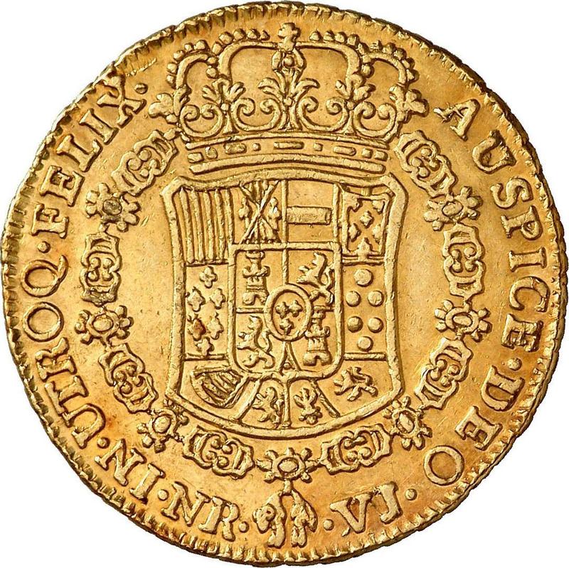 Find out the current coin value of the Colombia 4 Escudos 1770 with mark NR VJ. This gold coin from the times of Charles III struck at the Nuevo Reino Mint. Wondering how much a coin like this is worth? The record price belongs to the lot 32440 sold at the Heritage Auctions auction for USD 6,600. Bidding took place August 17, 2023.