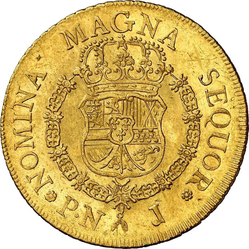 According to the latest data as of December 6, 2025 the average price of a Gold coin 8 Escudos 1761 with mark PN J is 3300 USD. The coin contains 24,759 g of pure gold, so we do not recommend selling it for less than 3341,29 USD, even if it is in poor condition and has no collectible value.