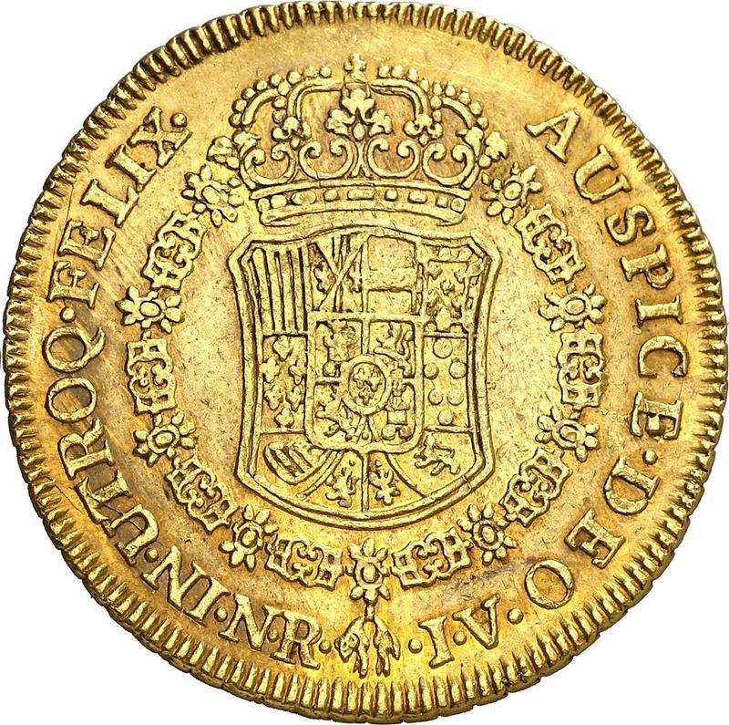 Find out the current coin value of the Colombia 8 Escudos 1765 with mark NR JV. This gold coin from the times of Charles III struck at the Nuevo Reino Mint. Wondering how much a coin like this is worth? The record price belongs to the lot 322 sold at the Aureo & Calicó, S.L. auction for EUR 15,000. Bidding took place March 14, 2019.