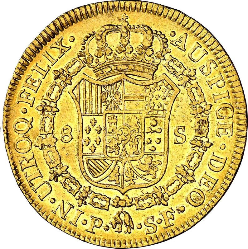 How much is the gold coin of Charles III 8 Escudos 1777 P SF?
