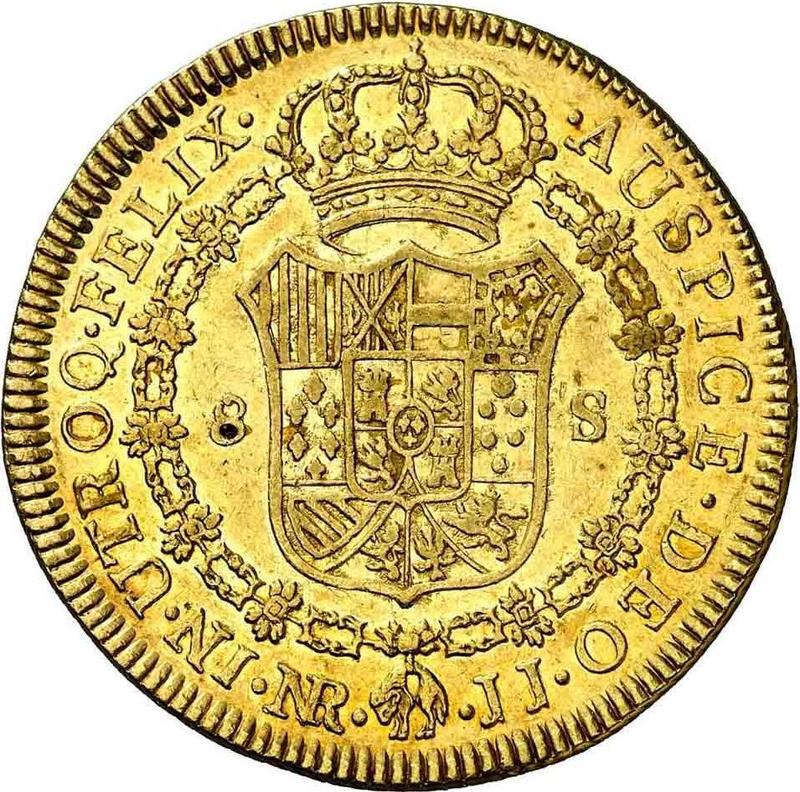 Find out the current coin value of the Colombia 8 Escudos 1792 with mark NR JJ. This gold coin from the times of Charles IV struck at the Nuevo Reino Mint. Wondering how much a coin like this is worth? The record price belongs to the lot 33059 sold at the Heritage Auctions auction for USD 12,000. Bidding took place August 27, 2025.