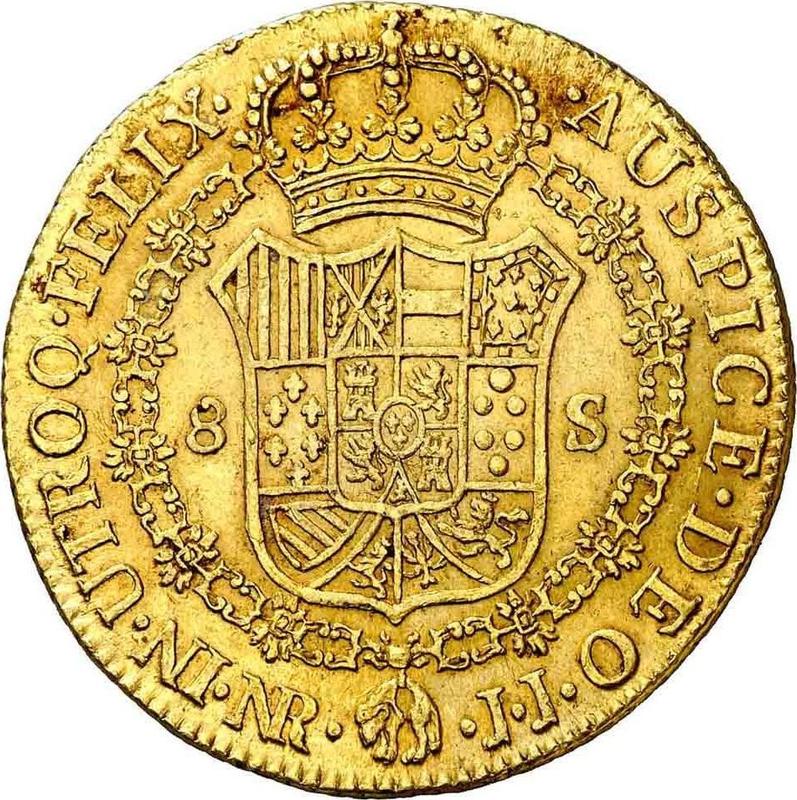 Find out the current coin value of the Colombia 8 Escudos 1800 with mark NR JJ. This gold coin from the times of Charles IV struck at the Nuevo Reino Mint. Wondering how much a coin like this is worth? The record price belongs to the lot 23616 sold at the Heritage Auctions auction for USD 6,463. Bidding took place September 6, 2012.