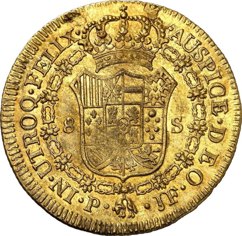 Find out the current coin value of the Colombia 8 Escudos 1809 with mark P JF. This gold coin from the times of Ferdinand VII struck at the Popayan Mint. Wondering how much a coin like this is worth? The record price belongs to the lot 31634 sold at the Heritage Auctions auction for USD 4,560. Bidding took place May 5, 2022.