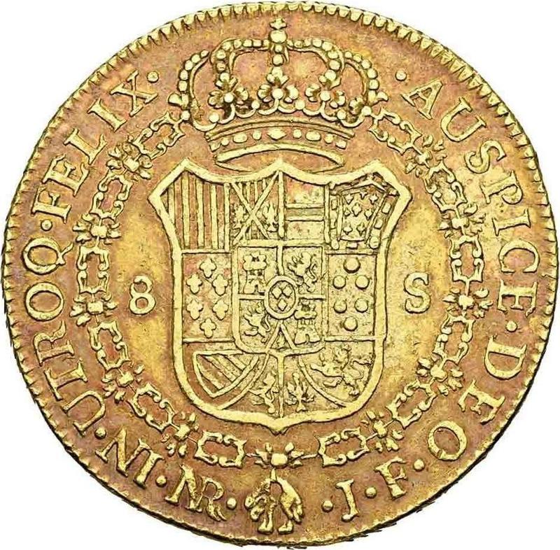 Find out the current coin value of the Colombia 8 Escudos 1810 with mark NR JF. This gold coin from the times of Ferdinand VII struck at the Nuevo Reino Mint. Wondering how much a coin like this is worth? The record price belongs to the lot 2036 sold at the Bolaffi S.p.A. auction for EUR 7,250. Bidding took place June 5, 2025.