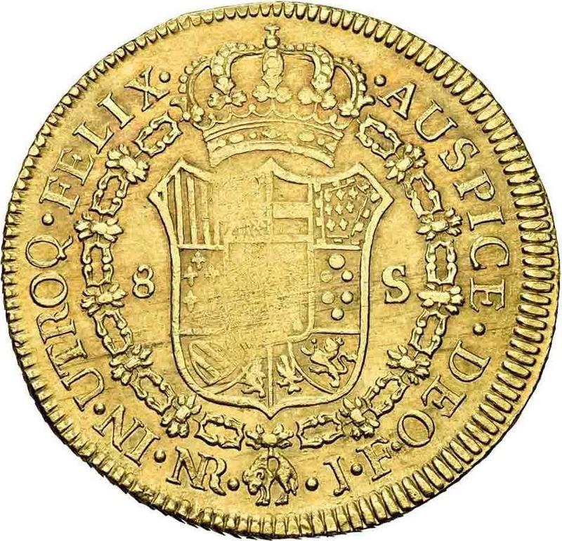 Find out the current coin value of the Colombia 8 Escudos 1820 with mark NR JF. This gold coin from the times of Ferdinand VII struck at the Nuevo Reino Mint. Wondering how much a coin like this is worth? The record price belongs to the lot 31242 sold at the Heritage Auctions auction for USD 8,400. Bidding took place November 1, 2024.