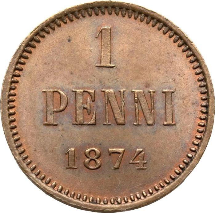 Find out the current coin value of the Finnish 1 Penni 1874 . This copper coin from the times of Grand Duchy struck at the Helsinki Mint. Wondering how much a coin like this is worth? The record price belongs to the lot 180 sold at the Pegasus Auctions AB auction for EUR 340. Bidding took place November 30, 2025.