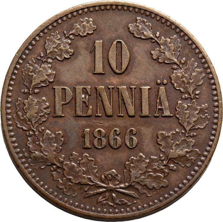 Find out the current coin value of the Finnish 10 Pennia 1866 . This copper coin from the times of Grand Duchy struck at the Helsinki Mint. Wondering how much a coin like this is worth? The record price belongs to the lot 186 sold at the Pegasus Auctions AB auction for EUR 1,100. Bidding took place December 8, 2024.
