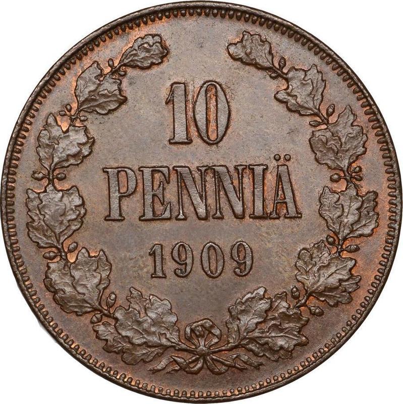 Find out the current coin value of the Finnish 10 Pennia 1909 . This copper coin from the times of Grand Duchy struck at the Helsinki Mint. Wondering how much a coin like this is worth? The record price belongs to the lot 221 sold at the RND auction for RUB 140,000. Bidding took place October 2, 2025.