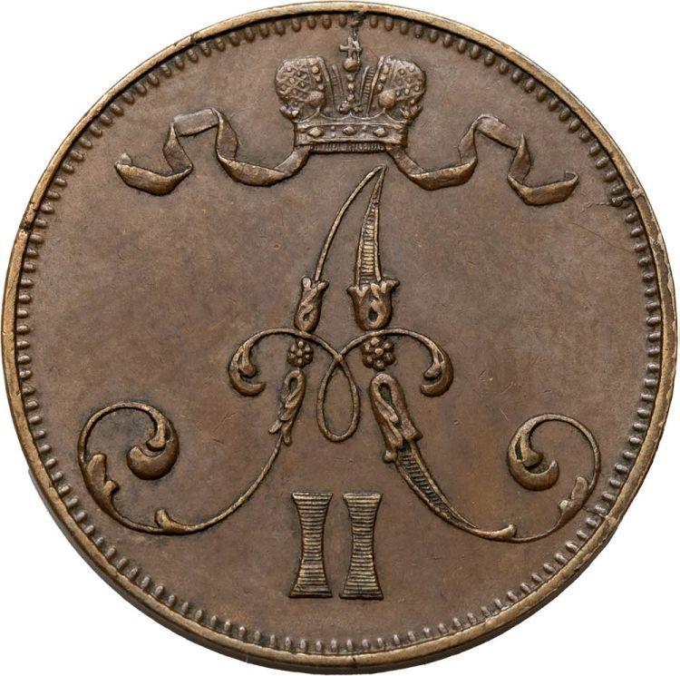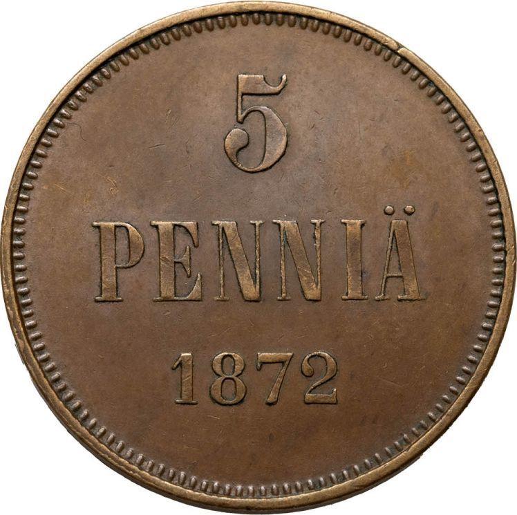 Find out the current coin value of the Finnish 5 Pennia 1872 . This copper coin from the times of Grand Duchy struck at the Helsinki Mint. Wondering how much a coin like this is worth? The record price belongs to the lot 3241 sold at the Fritz Rudolf Künker GmbH & Co. KG auction for EUR 1,000. Bidding took place March 10, 2009.