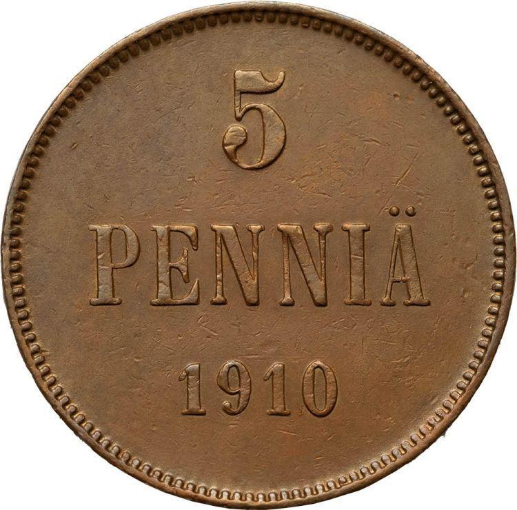 Find out the current coin value of the Finnish 5 Pennia 1910 . This copper coin from the times of Grand Duchy struck at the Helsinki Mint. Wondering how much a coin like this is worth? The record price belongs to the lot 1001 sold at the Rare Coins auction for USD 1,900. Bidding took place October 6, 2018.