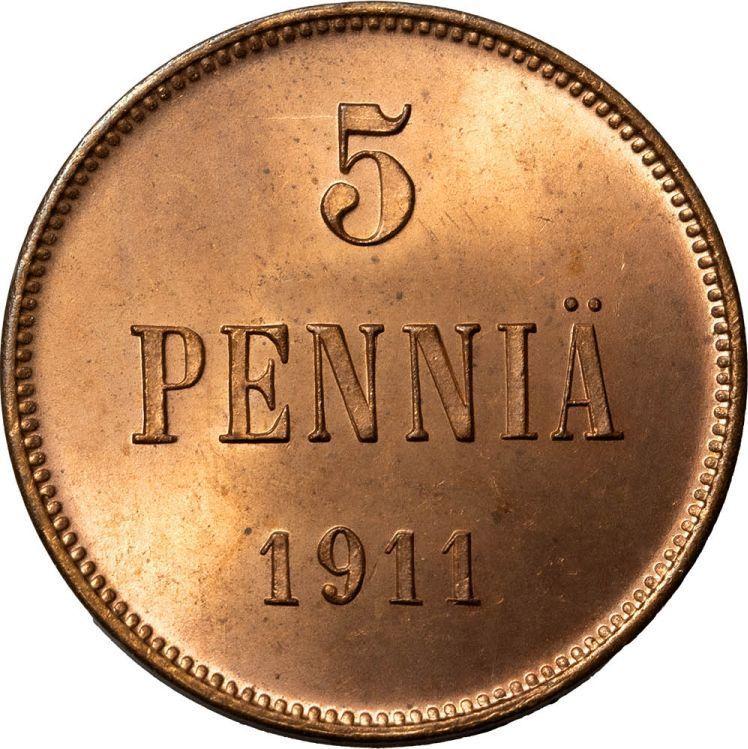 Find out the current coin value of the Finnish 5 Pennia 1911 . This copper coin from the times of Grand Duchy struck at the Helsinki Mint. Wondering how much a coin like this is worth? The record price belongs to the lot 62 sold at the AURORA auction for RUB 57,500. Bidding took place April 18, 2024.