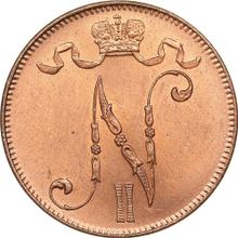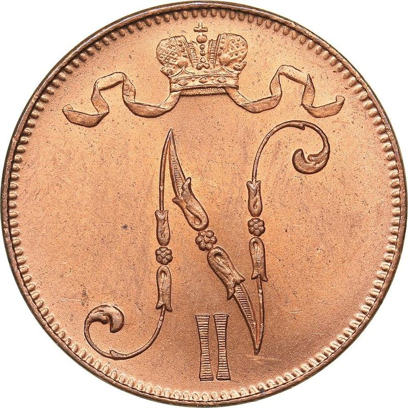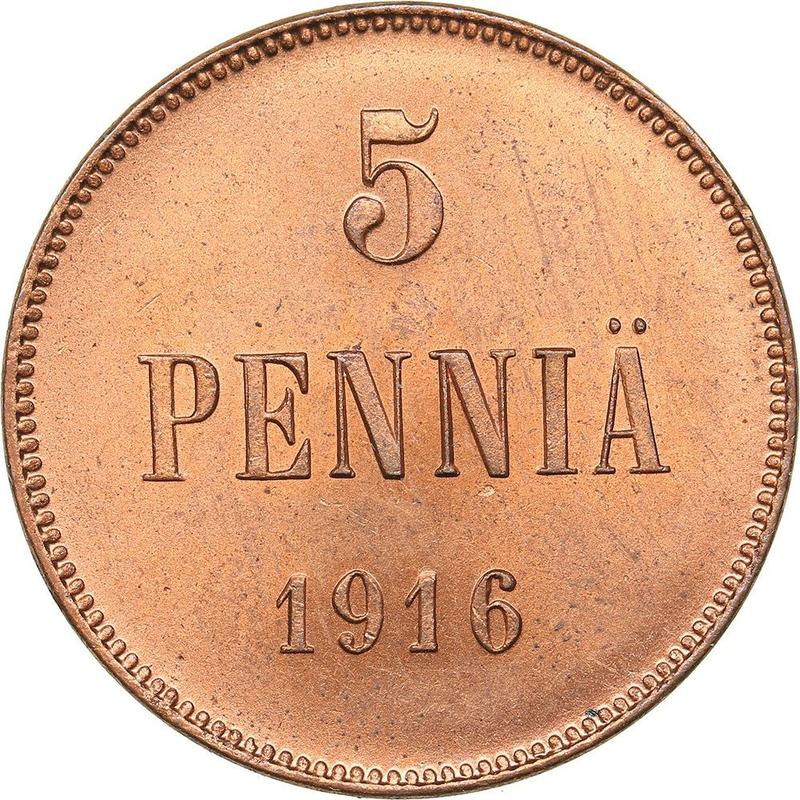 Find out the current coin value of the Finnish 5 Pennia 1916 . This copper coin from the times of Grand Duchy struck at the Helsinki Mint. Wondering how much a coin like this is worth? The record price belongs to the lot 18 sold at the Holmasto auction for EUR 190. Bidding took place March 9, 2024.