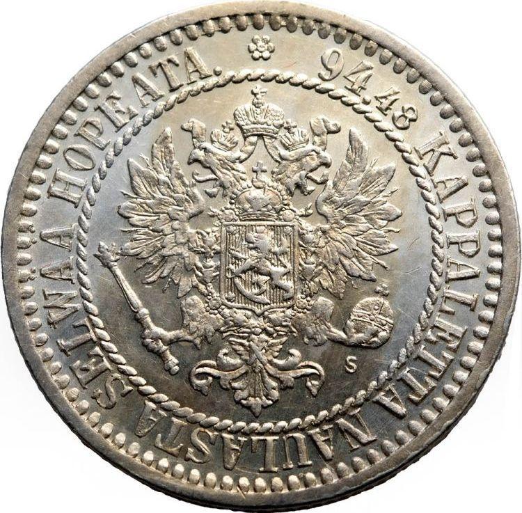 Find out the current coin value of the Finnish 1 Mark 1865 with mark S. This silver coin from the times of Grand Duchy struck at the Helsinki Mint. Wondering how much a coin like this is worth? The record price belongs to the lot 1022 sold at the Fritz Rudolf Künker GmbH & Co. KG auction for EUR 8,500. Bidding took place January 29, 2015.