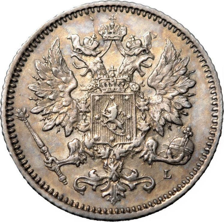 Find out the current coin value of the Finnish 25 Pennia 1891 with mark L. This silver coin from the times of Grand Duchy struck at the Helsinki Mint. Wondering how much a coin like this is worth? The record price belongs to the lot 671 sold at the Rare Coins auction for USD 1,100. Bidding took place June 10, 2017.