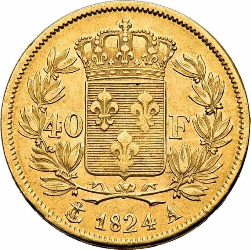 Find out the current coin value of the French 40 Francs 1824 with mark A. This gold coin from the times of Charles X struck at the Paris Mint. Wondering how much a coin like this is worth? The record price belongs to the lot 3698 sold at the Fritz Rudolf Künker GmbH & Co. KG auction for EUR 12,000. Bidding took place September 30, 2020.