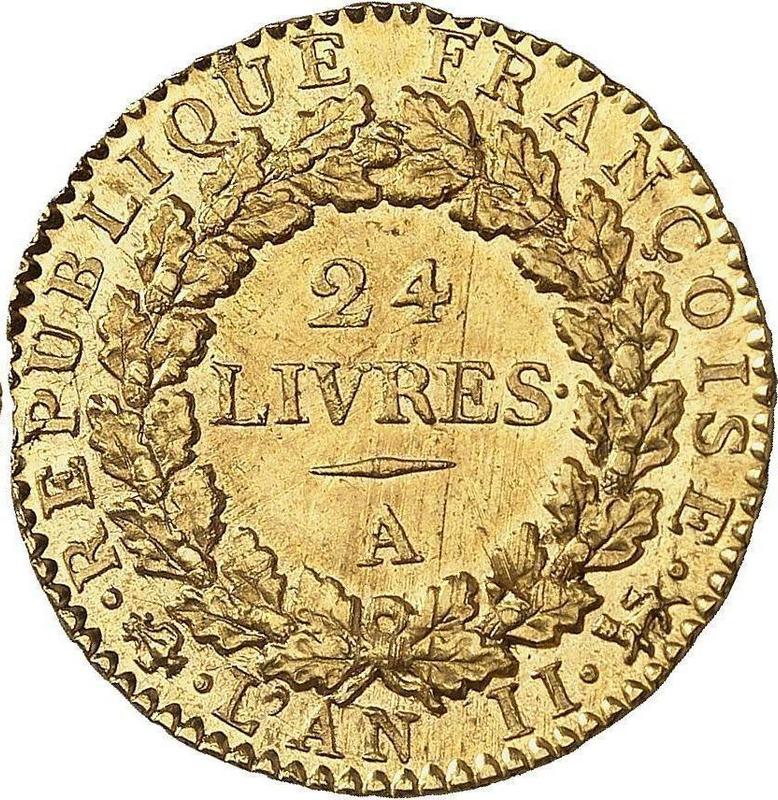 According to the latest data as of December 5, 2025 the average price of a Gold coin 24 Livres AN II (1793) with mark A is 3400 USD. The coin contains 7,0141 g of pure gold, so we do not recommend selling it for less than 960,81 USD, even if it is in poor condition and has no collectible value.